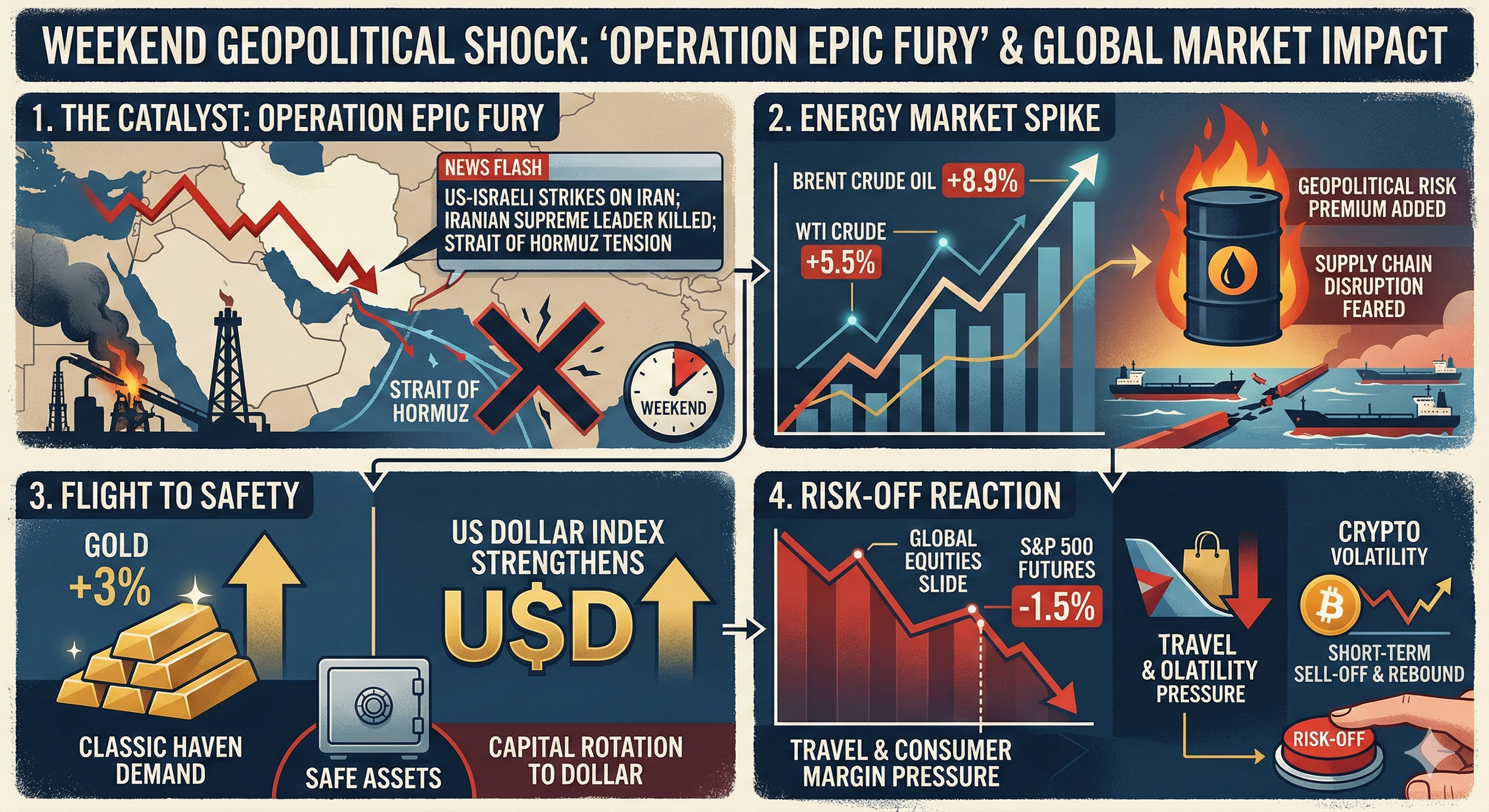 | WTI Crude | $72+ (live), Brent $80+ | ๐ด >$90 = stagflation risk | Hormuz now closed per Bloomberg. Brent +9.8%, hit +13% at open. Path to $90-100 dramatically shortened โ upgrade to ๐ด |